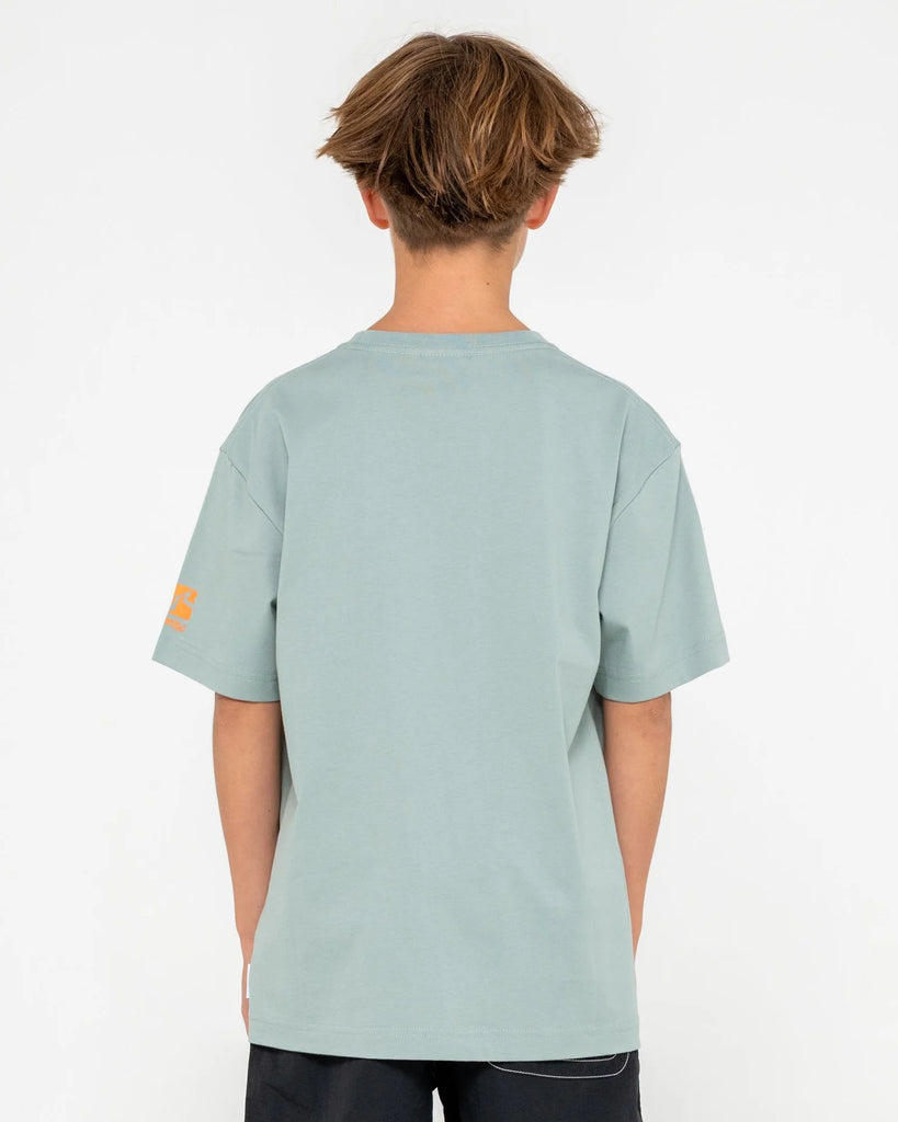 R2K Relaxed Tee With Rusty Chest And Sleeve Print. 100% Cotton Midweight Jersey