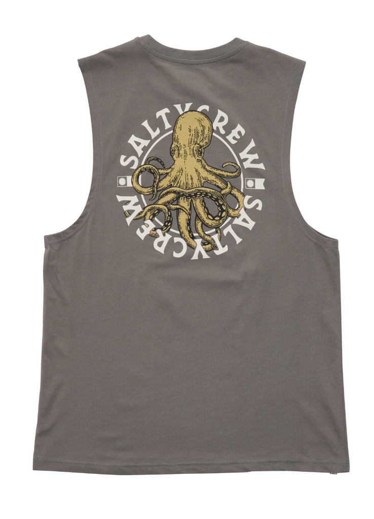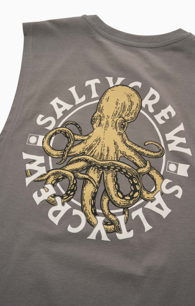 Tentacles Muscle Tank in White is crafted from ring spun Cotton Jersey, 160gsm in weight. It features a Salty Crew clamp label at the body hem and is finished with screen prints on the front and back.