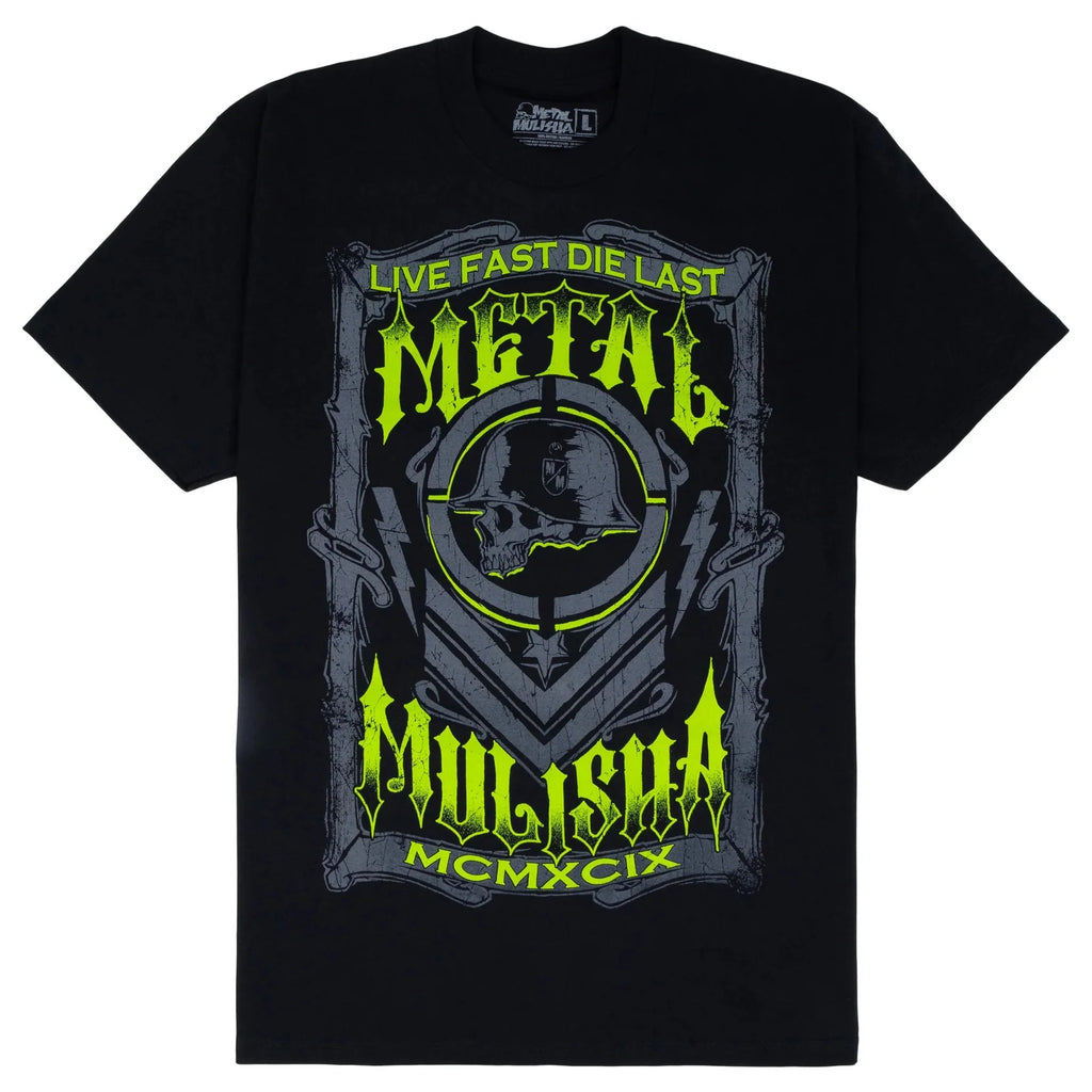 Metal Mulisha Live Fast Tee in Black features a large front MM chest hit in Grey and Monster Green.