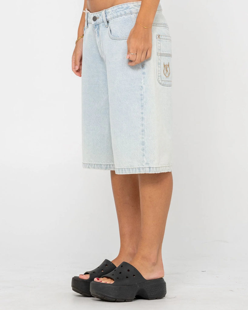 Low Rise 22" Outseam Denim Short With Back Pocket Embroidery. 100% Cotton Indigo Denim