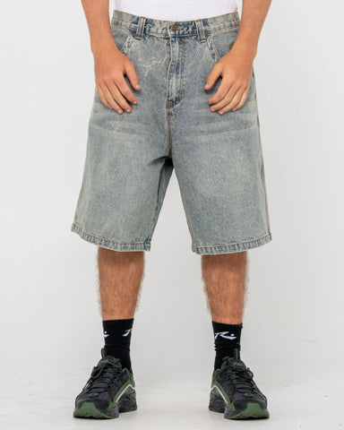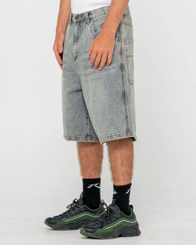 Baggy Fit Jort With Ochre Topstitch And Life Cycle Motif Embroidery. 100% Cotton Indigo Denim
