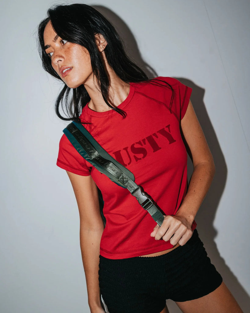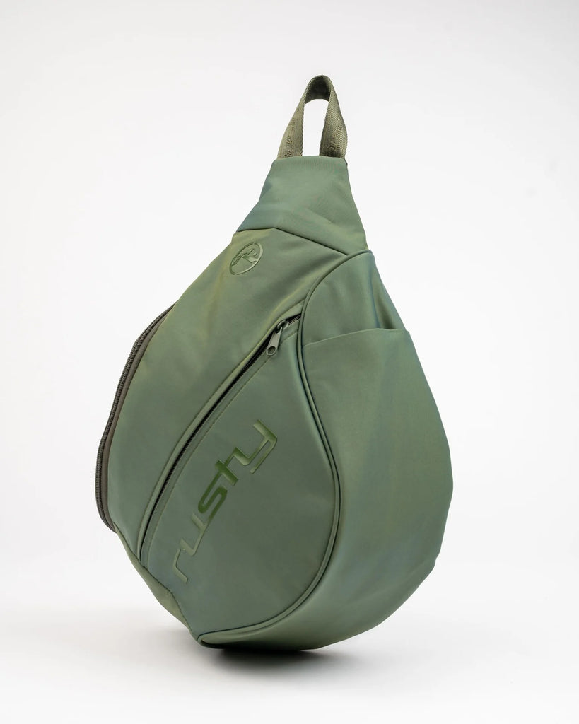 10l Sling Backpack With Adjustable Padded Shoulder Strap And High Density Printed Rusty Logos. 55% Nylon 45% Polyester