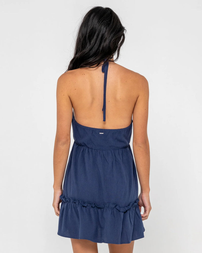 Mini Loose Fitting Halter Neck Dress With Mini Ruffle Detail. 30% Linen - 70% Viscose