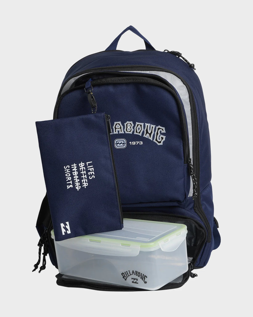 Features: Wet/dry pocket, free lunch box, detachable pencil case, 15" laptop compartment, external mesh bottle pocket