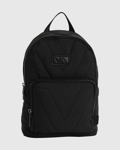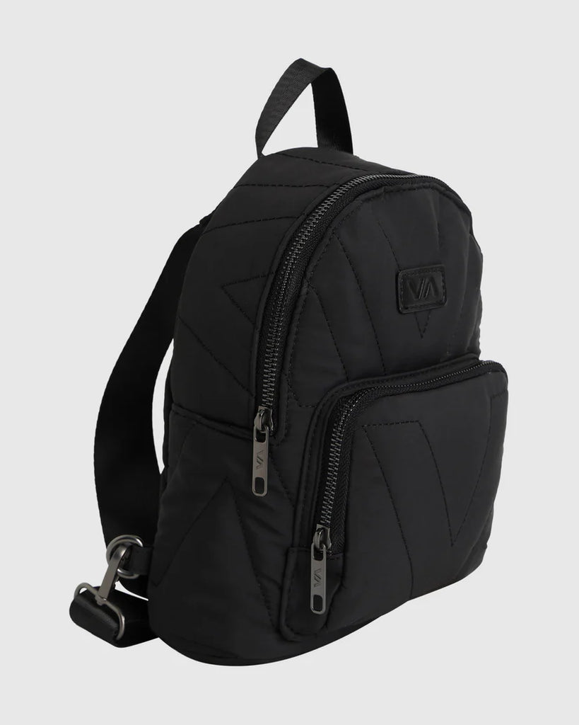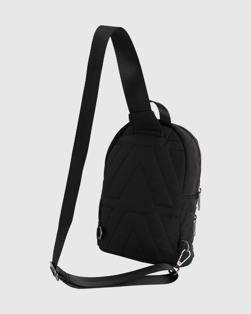Product: bagDimensions: 10" x 7" x 3.5"Quilted RVCA logo detailing on bodyLeft/right convertible nylon shoulder strapInterior zip pocketEmbossed PU patch labeMaterials: 100% Polyester
