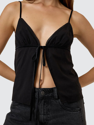 Show off your feminine side without losing edge with the Asher Tie Top in Black. This one's all about showing skin with just the right balance of attitude and elegance. Made from a silky rayon-Tencel blend, this black women's top features a plunging neckline, tie-front detail, and thin, delicate straps for a flawless fit. Soft drape and cropped cut make this piece from our Australian women's clothing spring lineup a go-to for day-to-night styling. It's perfect with women's black pants or black jeans for a sharp, street-ready look.