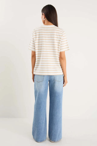 Upgrade your wardrobe with the Binding White Natural Stripe Boxy Fit Tee. Crafted from 100% cotton, this oversized t-shirt offers a soft and breathable fabric, ensuring maximum comfort throughout the day. Featuring a relaxed boxy fit and classic natural and white stripe pattern, this t-shirt will make a versatile addition to any outfit. Whether it is styled for casual outings or a stylish day in, the Binding oversized t-shirt will make a perfect addition to your capsule wardrobe.