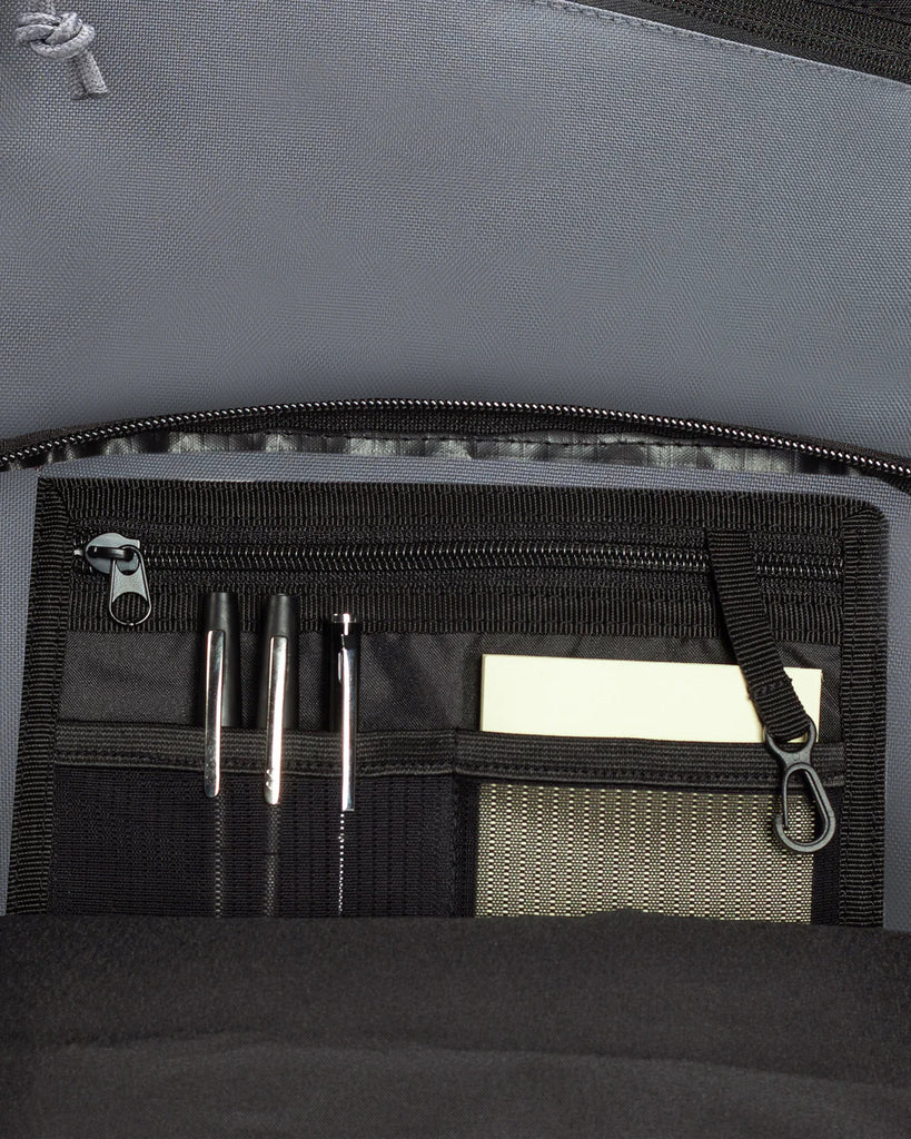 Main body zipper compartment with padded laptop sleeve in main compartment and tricot lined top upper front zip pocket